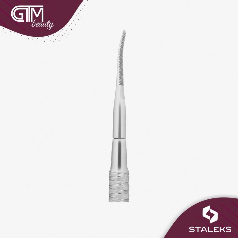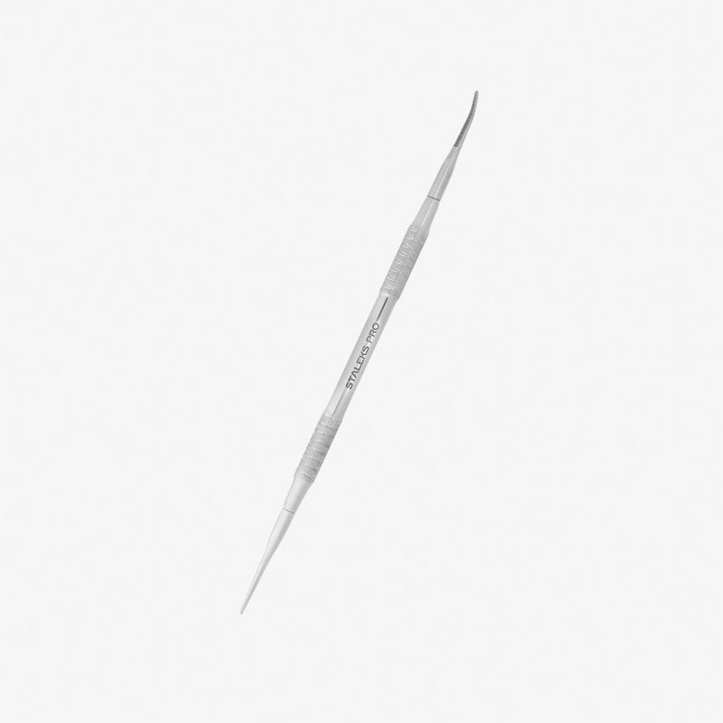 Double-sided spatula with knurled steel handle. Two nozzles from stainless steel (20Х13) for processing of the grown nails. Sharp working parts slightly wider than those of the LV-02, have serrated notches on the inside in the form of an “elevator”. In the manufacture were taken into account the wishes of the masters of manicure and pedicure, so the working parts of the tool are quite thin, while not scratching the surface of the nail and allow you to get to the most inaccessible places. When used strictly for the purpose blades (pusher), curettes and pedicure files are practically not subject to wear.