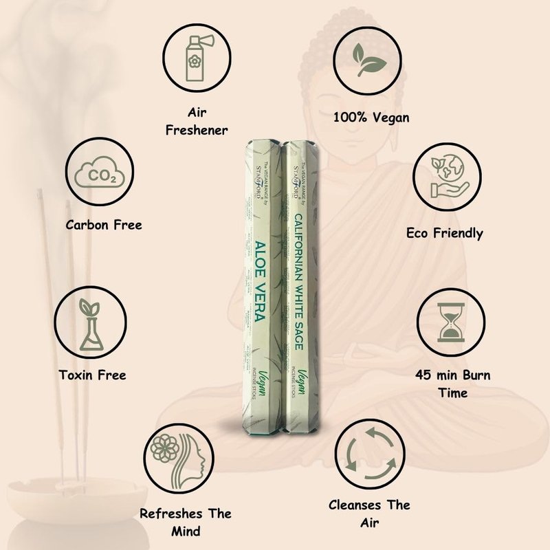 - BeVeg vegan-certified premium incense sticks. Variety pack consist of AloeVera, Amber Forest, Californian White Sage, Cinnamon Spice, Citronella. Each pack contains 20 incense sticks. Total 120 incense sticks. Each joss sticks have burn time of 45 minutes.