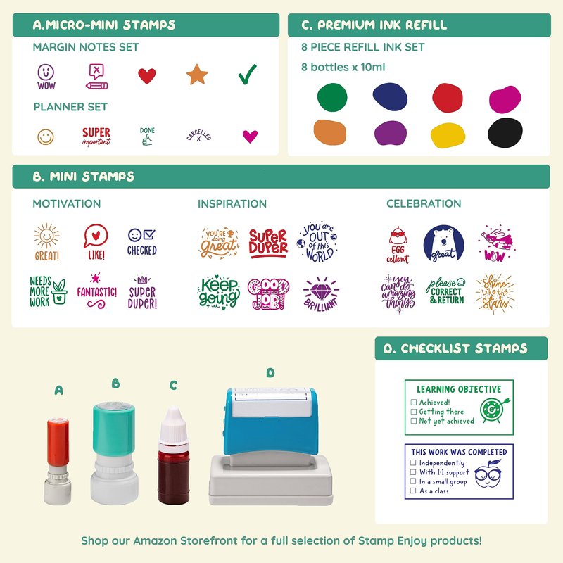 Premium Refill Ink for Self Inking Stamps, 8 Color Set, Water-Based, Multicolor Teacher Stamps, Office Stationery Stamps. For use with self inking stamps, ink pads, and stamp pads.