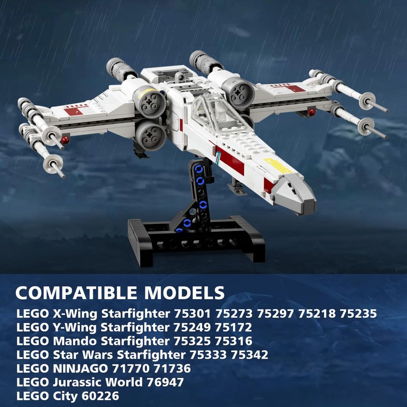 - 【Versatile Compatibility】:Our display stand is designed to fit multiple Lego building kits, including the X-Wing Starfighter 75301, 75297, Mando N-1 Fighter 75325, 75316, and OBI-Wan Kenobi’s Jedi Starfighter 75333; Zane’s Golden Dragon Jet 71770; Legacy Boulder Blaster 71736; Dominion Quetzalcoatlus Plane Ambush 76947; LEGO City Space Mars Research Shuttle 60226; Republic Fighter Tank 75342.