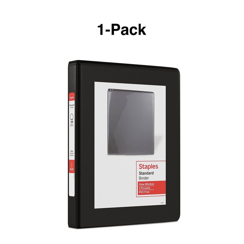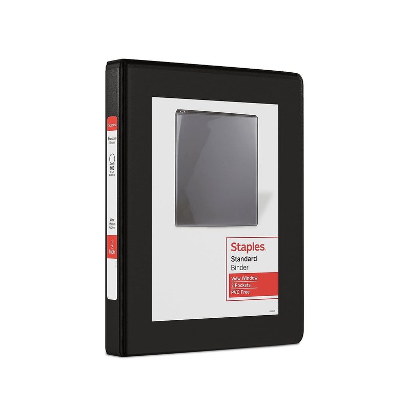 Store your smaller papers in this Staples standard 5.5 x 8.5-inch 0.5-inch round-ring black mini view binder. Turn pages smoothly with this Staples standard mini view binder. The interior has two pockets for additional storage, while the 0.5-inch rings resist gapping. The cover panels are made with nonstick, archival-safe material to prevent the ink on your papers from smudging. This Staples standard mini view binder holds any 5.5 x 8.5-inch paper and is lightweight for easy transporting. Black view binder is an excellent choice for storing spreadsheets and other wide papers. Three round rings keep pages secure. 100-sheet capacity offers ample storage. Suits 5.5" x 8.5" pages, ideal for compact organization. Durable covers are made of plastic with nonstick surface. Four pockets for organization. Insert a custom removable spine label for easy identification of the contents.