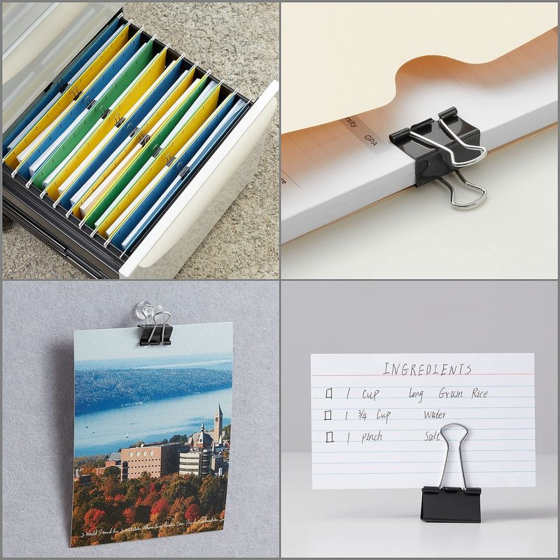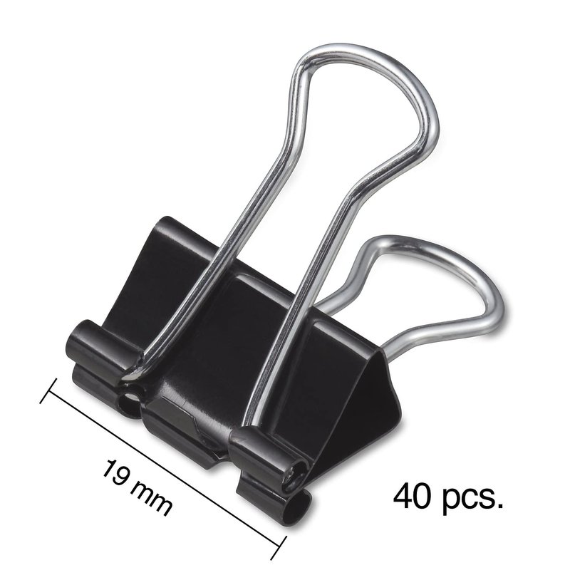 - Binder clips are a great way to keep your loose reports or client documents together in one spot. Black in color. Made of metal. Width: 0.75". With 0.38" capacity for document storage, these fasteners keep heftier files together. Sold in pack of 40.