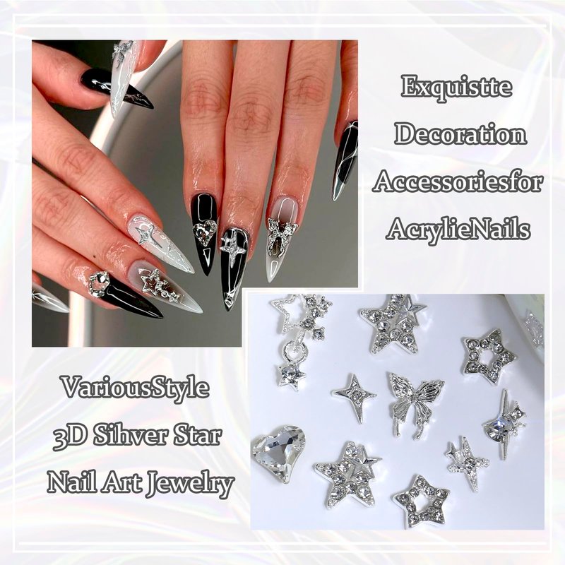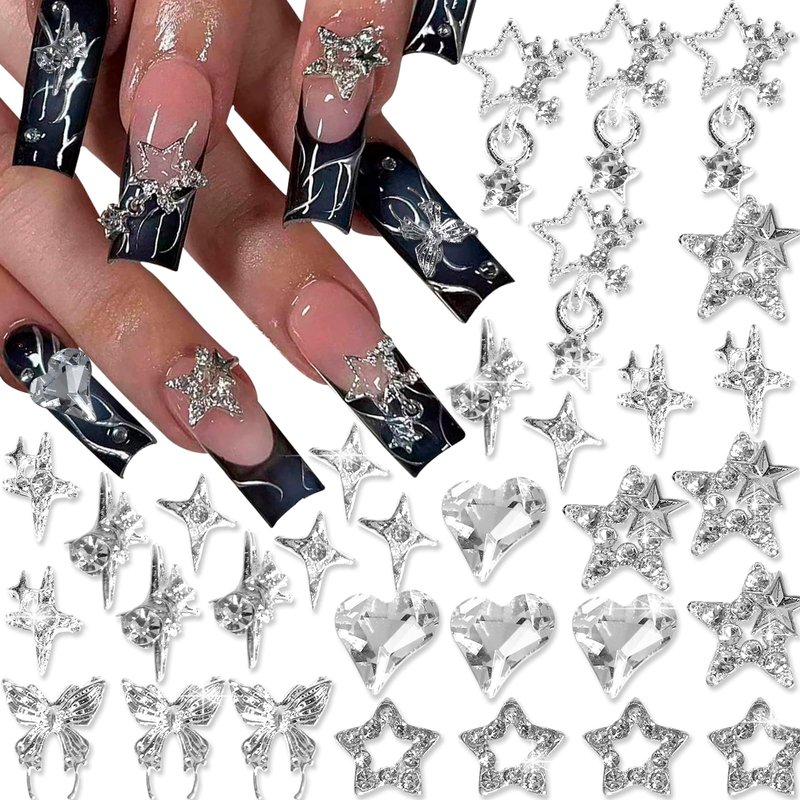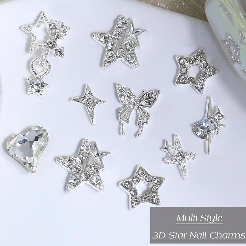- Star Nail Charms: charming design nail decoration charm in the shape of a star butterfly, shiny nail crystal diamond rhinestones are set on it by a silver metal alloy base, very shiny when you get it