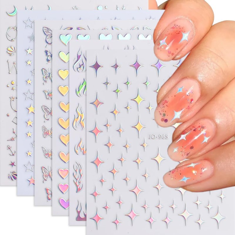 Star Nail Stickers, Holographic Star Nail Decals Heart Butterfly Shinning Stars Nail Designs Aurora Silver Nail Art Supplies for Women Girls(6 Sheets)