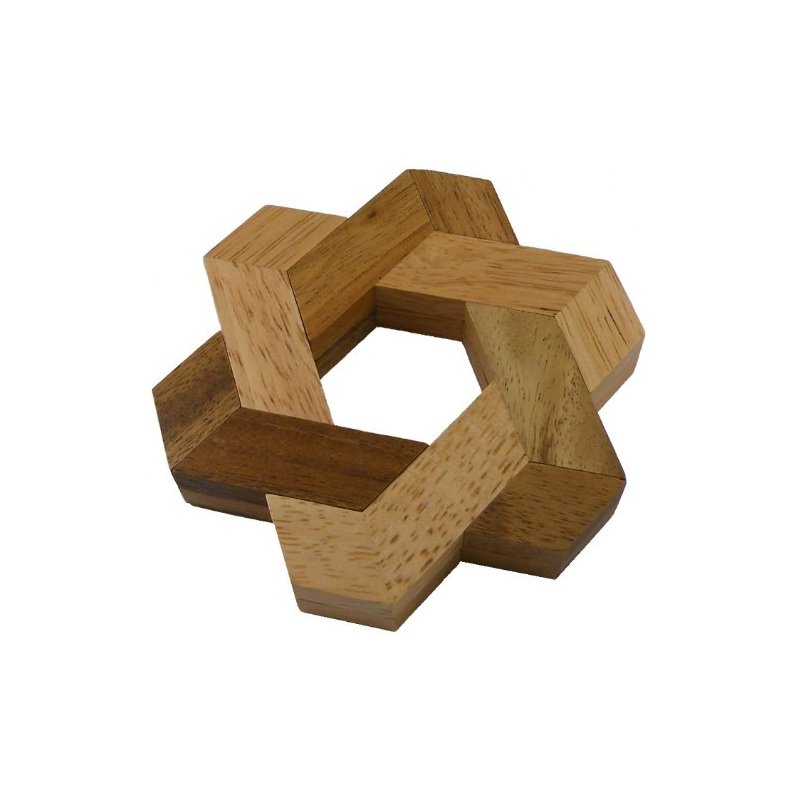 This tricky hexagram, or Star of David, is comprised of 6 identical pieces. Once you figure out how to take it apart- can you put it back together? The fact that none of the pieces have right angles makes this particularly challenging for people who have experience with more conventional puzzles. A wonderful surprising puzzle. Hard to solve for age 13+ and adults.