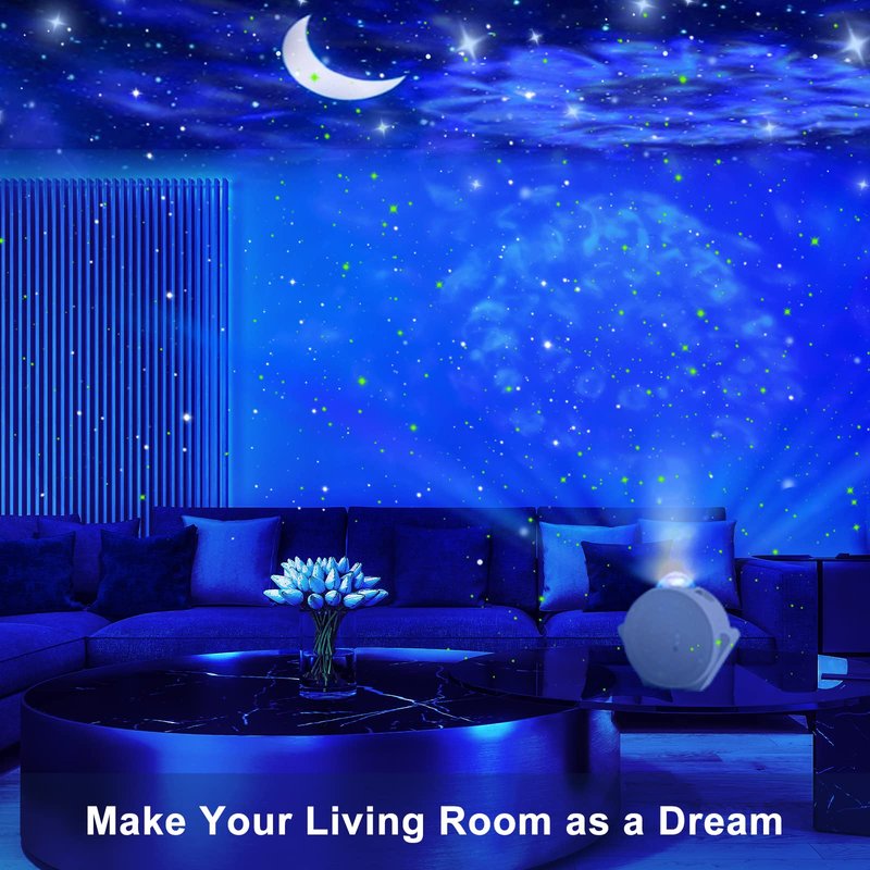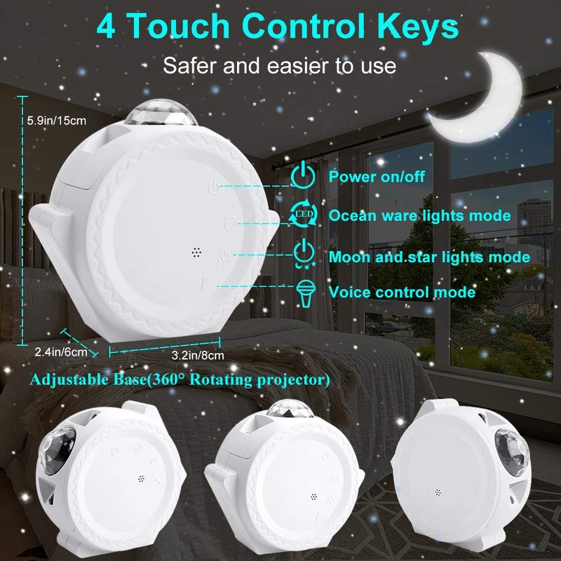 - 【Remote&Touch Activate Flicking Star Light】You can control the galaxy projector with the remote. Besiedes, 4 touch buttons make it easier for adult and children to use. (Power On; Ocean Ware Lights; Moon and Star Lights; Voice Control). Start the voice control mode, all the light is off, while the star light senses sound, such as playing a song or clapping your hands, the lights will flash according to the rhythm of the sound, create a relaxed and warming atmosphere.