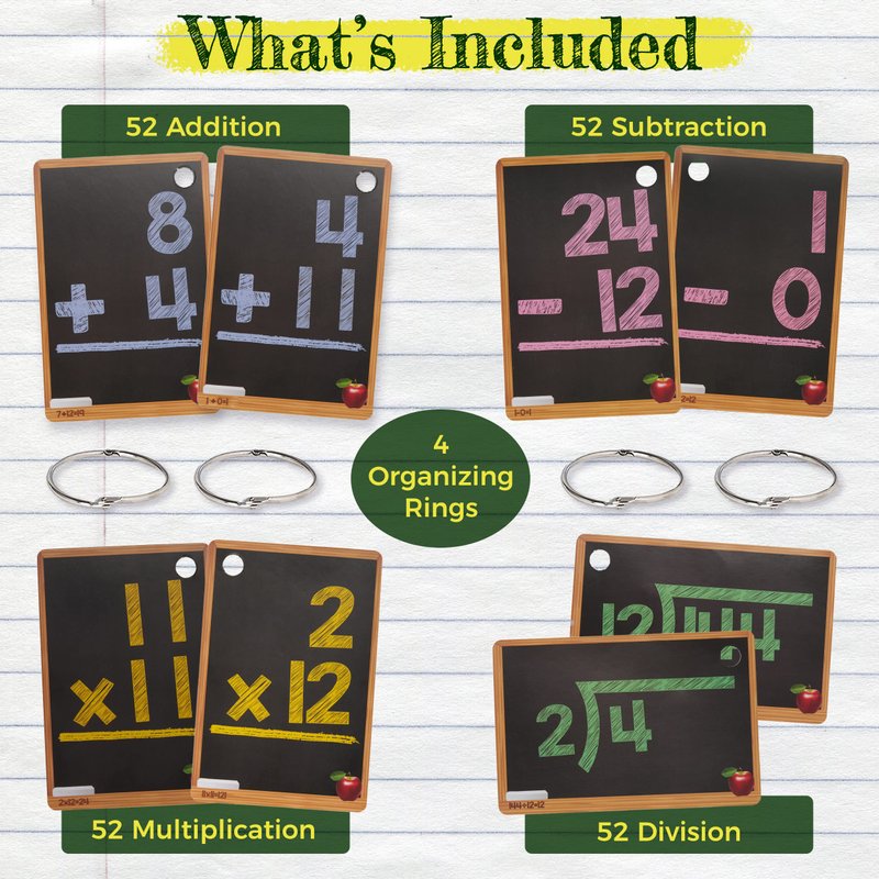 - PACKAGE INCLUDES - (1) addition flashcard set (52 cards), (1) subtraction flashcard set (52 cards), (1) division flashcard set (52 cards), (1) multiplication flashcards (52 cards), and (4) metal sorting rings.