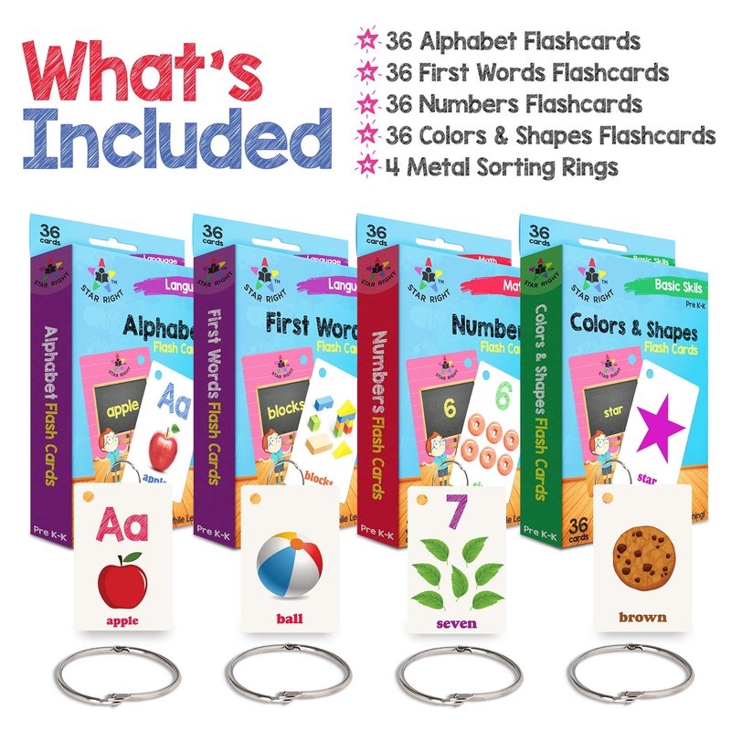 Star Right Words Toddler Flash Cards Set of 4 - Number Flash Cards, First Words, Colors and Shapes, & Alphabet/Letter Flashcards - 4 Binder Rings - 144 Sight Words Kindergarten Flash Cards 3-7 Years