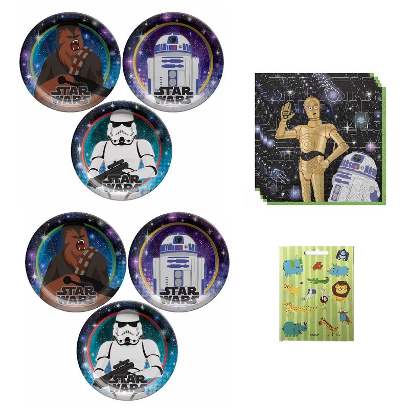 Star Wars Galaxy Birthday Party Supplies Bundle Pack includes 16 Dessert Cake Paper Plates, 16 Dessert Cake Napkins, 1 Jungle Animal Sticker Sheet (not Star Wars stickers).