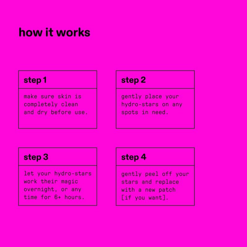 - ⭐ CUTE & EFFECTIVE: A star-shaped pimple patch that's out of this world. Made with 100% hydrocolloid to help absorb fluid, reduce inflammation, and shrink spots while looking cute.