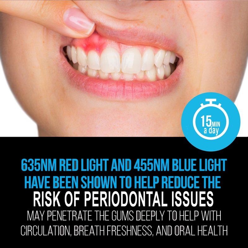 Oral Care Gum Light 16 635nm LEDs red light therapy and 16 455nm blue light therapy dental light. Many dentists recommend red light and blue light to lessen tooth pain, slow gum bleeding, stimulate tissue and gum regrowth, reduce bleeding gums and periodontal issues. *Daily use may also help freshen breath, help with healthy gums, and act as help for toothache or a dry socket protocol. Plugs into iphone, android, usb, and usb-c, no charging needed. Red and Blue LED Light therapy is cumulative and should be used ongoing for best results.