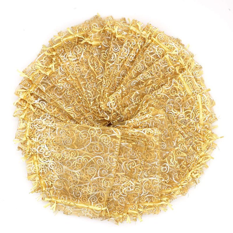 Staruby Organza Gift Bags 100Pcs Gold Sheer Organza Bag 4x6 Inch Mesh Favor Bags Drawstring Jewelry Rattan Printed Gift Pouches for Wedding Party Favors Baby Shower Christmas Gifts Candy Bags