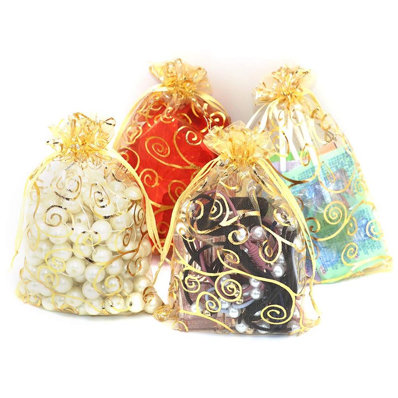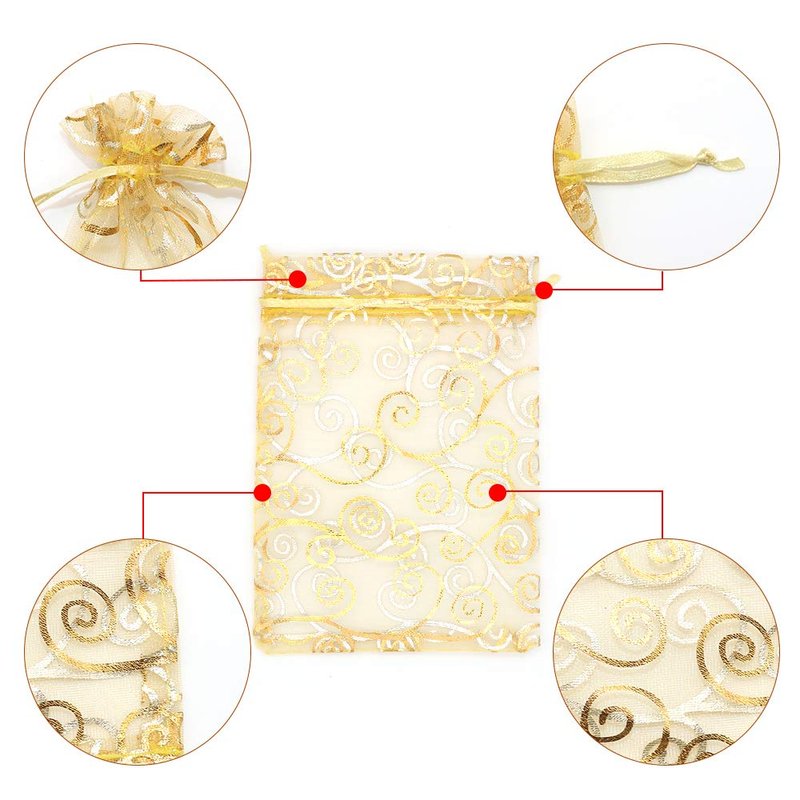 - Easy to use: They are made of organza, which is a thin, plain weave, sheer fabric. Each bag features a decorative satin drawstring for tying. You can put small things in the gold gift bags then tighten the sealing and loose the sealing as you want to take things out.