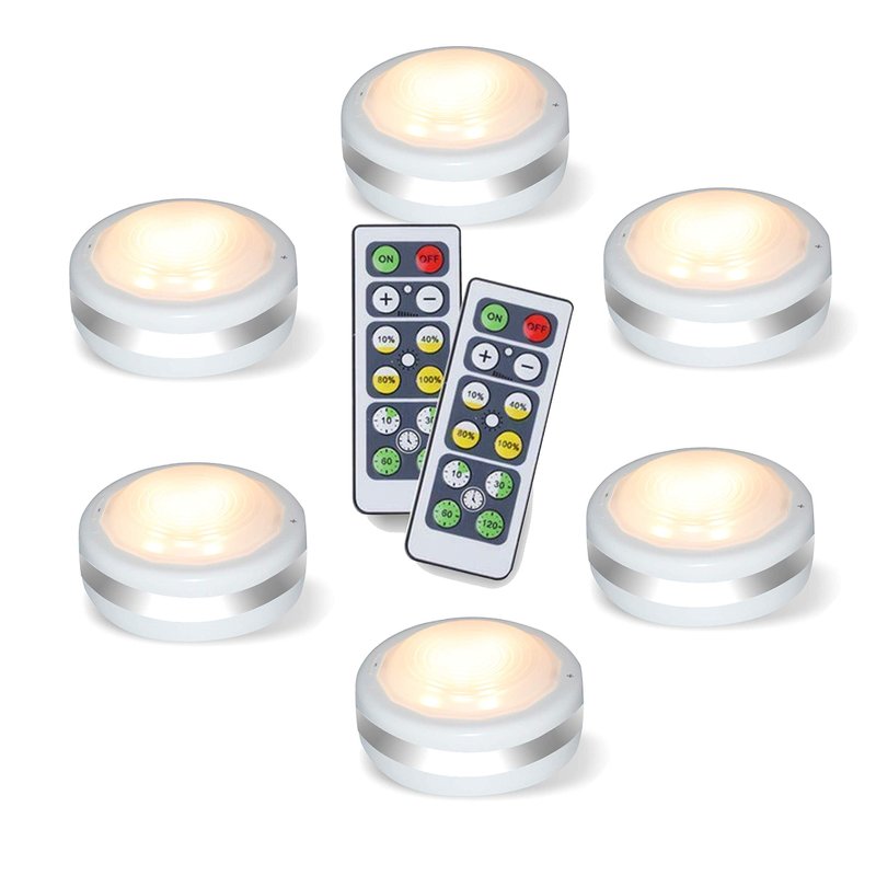 - TWO CONTROL MODE: 6 led puck lights with 2 remote controls. Adjust brightness effortlessly with a manual press or remote control, ensuring your cabinet space is perfectly lit. The best remote control distance range: 1.6 feet~20 feet.