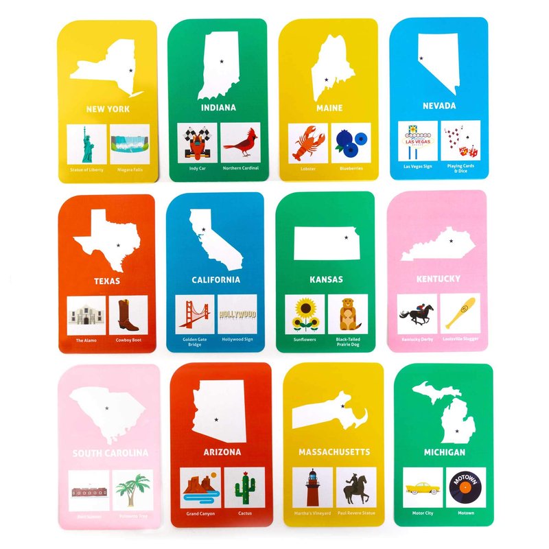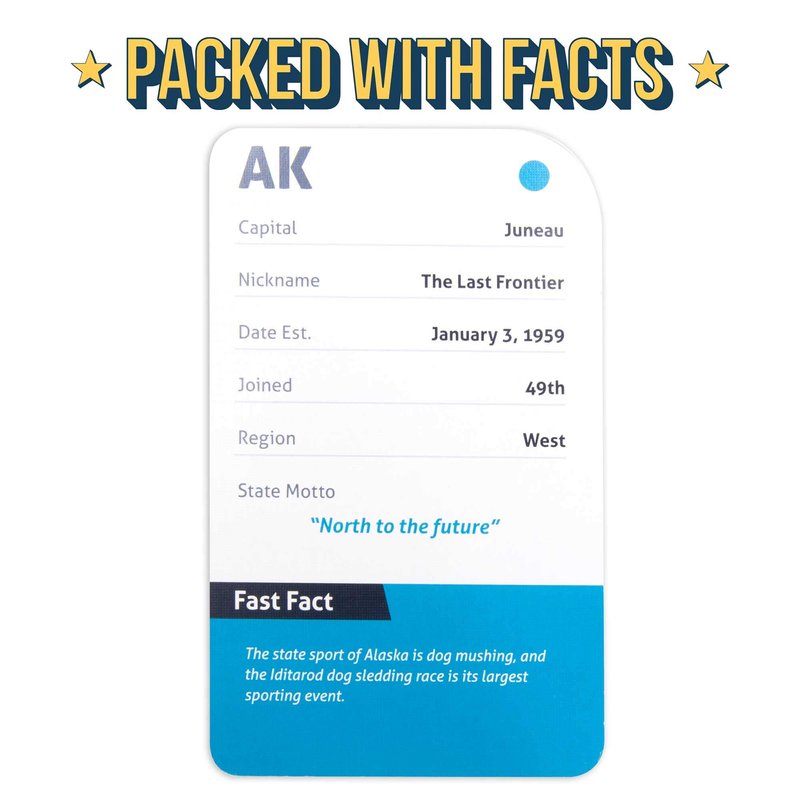 Each pack includes 50 premium, jumbo-size 5.25" x 3.25" cards. Great for classroom games and teaching. They're especially easy to see from a distance and easy to read for educators. Teach and participate in 9 specially made enrichment activities: Name Games, What's the Motto, Heads Up, Region Round-up, State Trivia and more! Fun symbols like the Golden Gate Bridge, Statue of Liberty, and Mauna Loa Volcano!