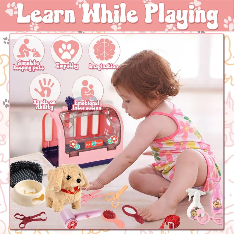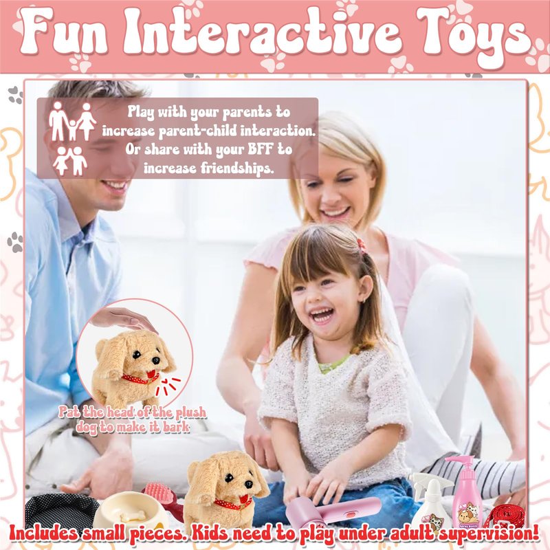 - Educational Dog Toys for Kids: From bathing to getting a haircut, kids can imitate everything and can easily do it. By experiencing various pet care activities and using different accessories, children can improve their imagination and hands-on ability. It also helps kids cultivate their patience and empathy during the game.