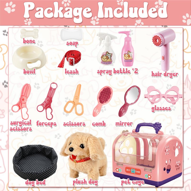 - Fun Plush Interactive Toy Set: Including an electronic plush toy dog, pet cage, dog bed, dog leash, hair dryer, 3 scissors, glasses, mirror, comb, 2 spray bottles, soap, bowl, bone, and sticker. With these accessories, your little girl can experience different pet care activities for the realistic plush dog, like grooming, feeding, and simply checking!