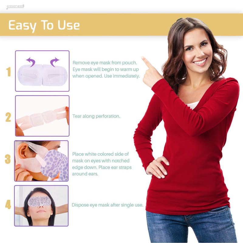 As you go through the day, you put a lot of wear and tear on your eyes, which can make them look and feel less than appealing. Our Heat Eye Mask is the perfect way to rejuvenate them. Use our product to instantly soothe and refresh your tired Hard-Working Eyes, in as little as 10 minutes, while you sit back and relax in your favorite chair. It simple and easy to use, just open the eye mask and unfold it, Hold one side of the eye-mask with both hands and bend the heat pack back and forth in a wiggling motion, allowing breaking the absorbing layer and let the scent and heat come out, Our steam eye mask comes with several scents, Lavender, Jasmine, Rose or if you are sensitive to scent, choose no-scent. find your favorite fragrance. If it's convenience you're after, we have you covered. The EssencellHB Heat Eye Mask was designed to be portable so that you can use it at home, work or on the go. Now that you know how much better our Heat Eye Mask can make your life, why not order yours today on Amazon.com.
