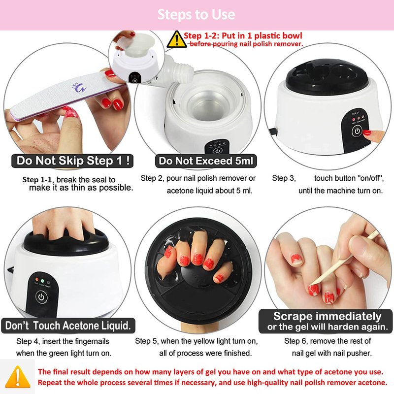- Removes nail gel polish safely and without damaging the nails, without making nails thinner and thinner---During the steaming process, when the nail gel has softened, we need to take it out and immediately remove it with cuticle nail pusher, repeating these 2 steps until the nail gel is completely removed.