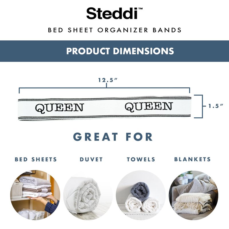 Steddi Bed Sheet Organizer Bands, Sheet Bands for Organizing, Sheet Organizer Bands, Sheet Labels for Bedding, Sheet Size Label Bands for Bed Sheets, Pillow Case, Duvet (Queen)