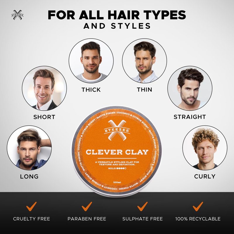 - ✅WORKS WITH ALL HAIR TYPES & STYLES: No matter your hair type or hair style, Clever Clay will give your hair hold, texture, and will not harden your hair to a helmet. Long, short, thick, thin, straight, or curly hair, Clever Clay will work for you!