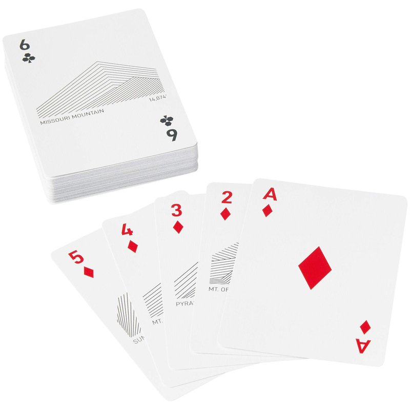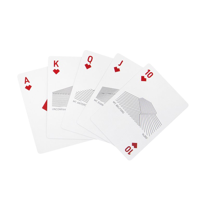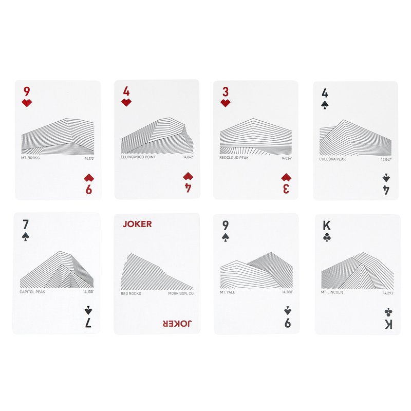 Peak Playing Cards feature Colorado mountains with elevations of at least 14,000 feet, known as Fourteeners. These mountains bring beauty and thrill to all who choose to explore them. Each card represents a different mountain, with minimal line art design displaying its unique shape and elevation.