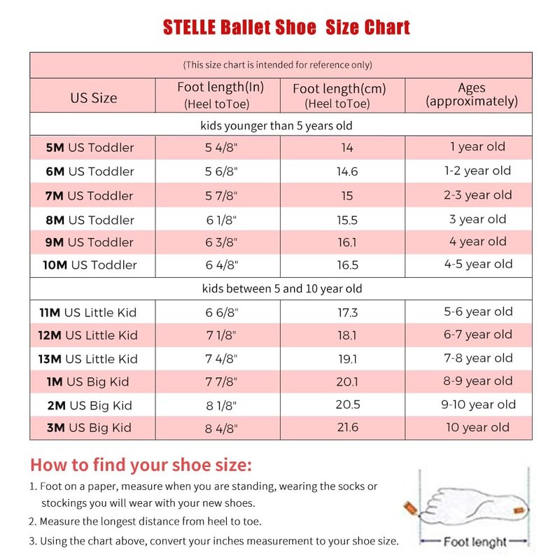 - Size Choice: True to size. Refer to the shoe size chart in images for proper sizing. Dance shoes are supposed to fit close to the foot, they aren't supposed to fit like regular street shoes, Please measure your kids' foot length for the best fit. For kids younger than 5 years old, please order 5 Toddler - 10 Toddler; For kids between 5 and 10 year old, please order 11 Little Kid - 3 Big Kid . Boys might need to order one size up.