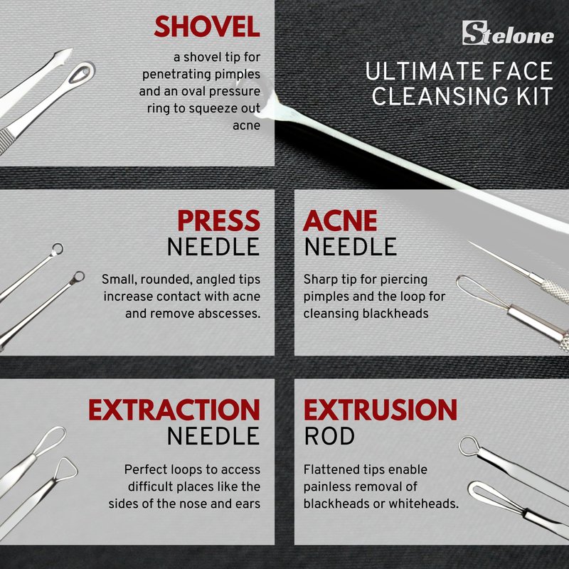 The Pimple Extractor Kit is a set of 10 professional-grade tools that can help you safely and effectively remove pimples, blackheads, whiteheads, cysts, and other blemishes from your face and body. These tools are made of high-quality stainless steel that is durable, rust-resistant, and easy to sterilize. They have different shapes and sizes to suit different types of skin problems and areas. They also come with a handy case and a pair of tweezers for convenience and hygiene.