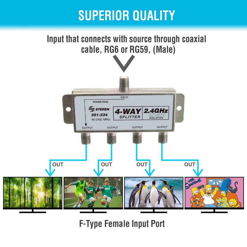 STEREN 4-Way 2.4GHz 90dB 1 Port Power Pass DC Passing On One Port F-Pin Coaxial Splitter [201-234]