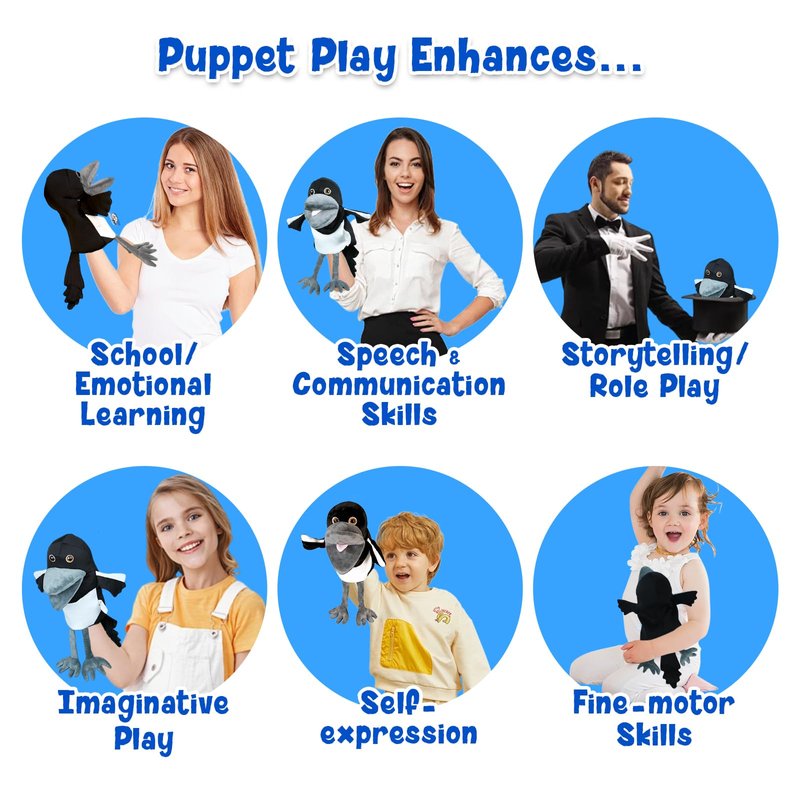 - PROMOTES INTERACTIVE & IMAGINATIVE PLAY — Our plush hand puppet isn't just a magpie toy—it sparks creativity and storytelling. It improves motor skills, hand to eye coordination, emotional expression, and communication.