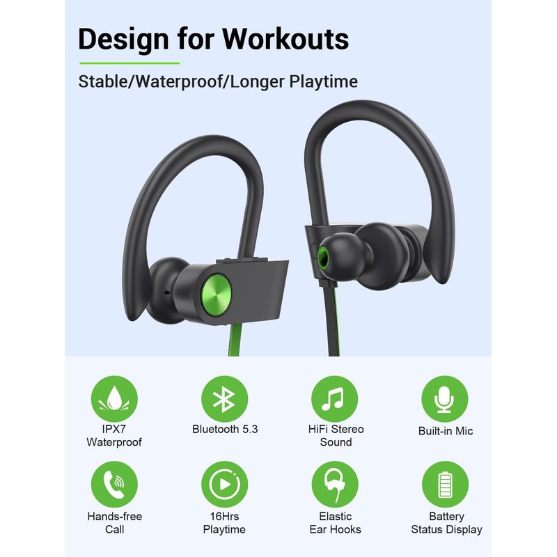 Stiive Bluetooth Headphones, 5.3 Wireless Sports Earbuds IPX7 Waterproof with Mic, Stereo Sweatproof in-Ear Earphones, Noise Cancelling Headsets for Gym Running Workout, 16 Hours Playtime - GreenBlack