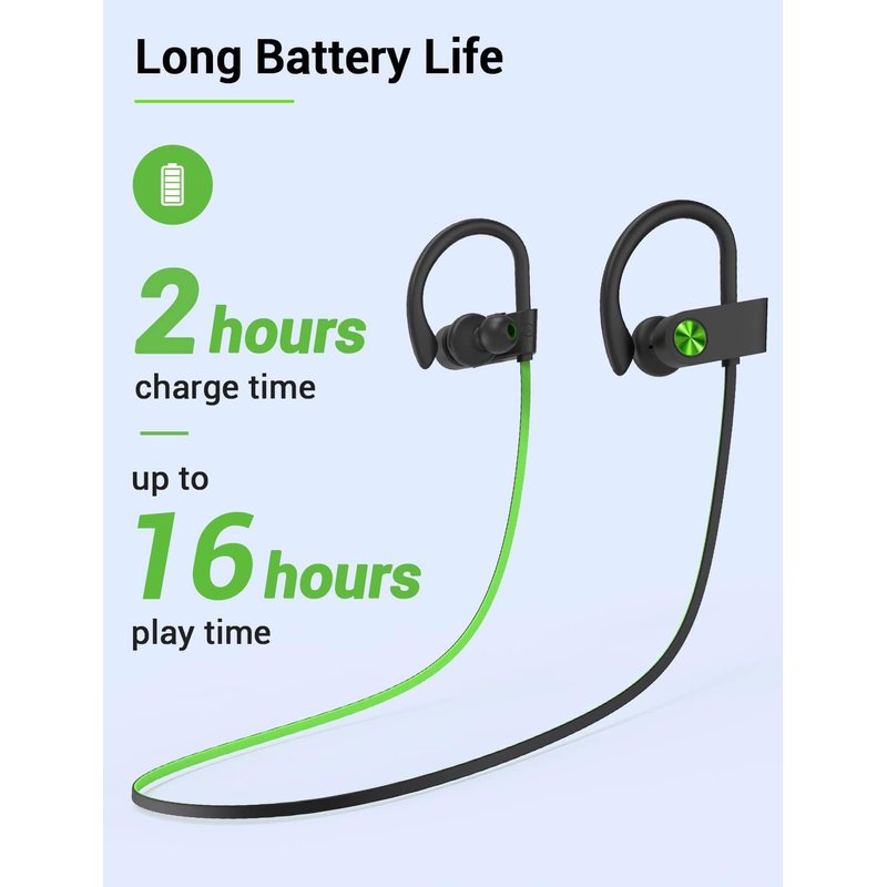- Up to 16 Hours Playtime: The rechargeable battery of Bluetooth earbuds supports up to 16 hours of playtime with just 2 hours of charging. Prolonging time meets your demands of continuous and enjoyable exercise. And it will show the remaining battery power of the headphones on your Phone screen. (Note: Please fully charge it by using the charging cable that comes with it for the first use)