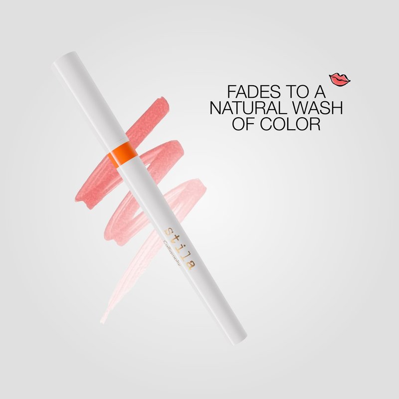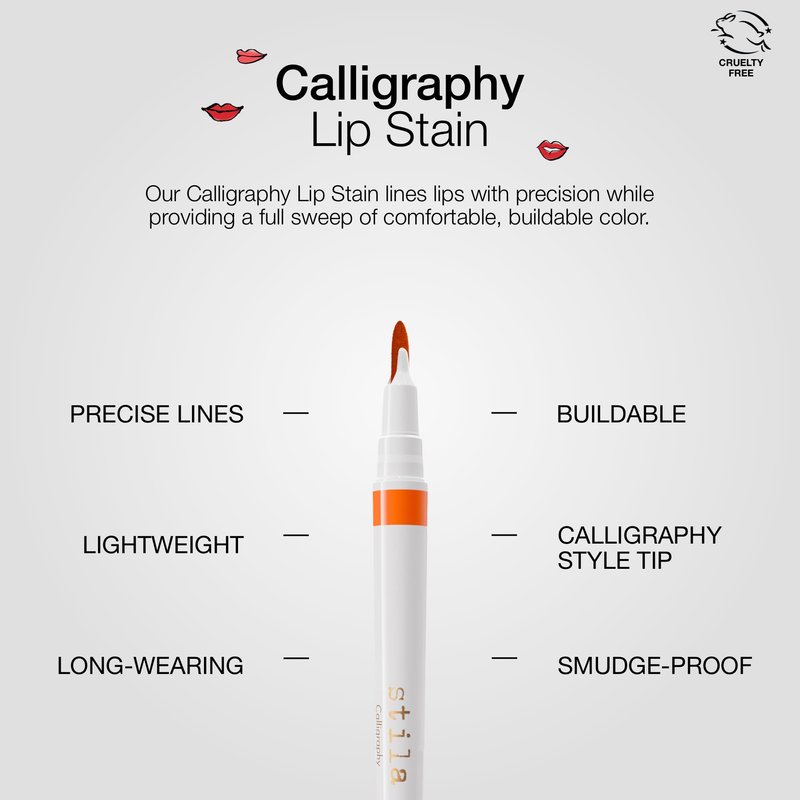 - PRECISE LINES: Our double-duty Calligraphy Lip Stain lines lips with precision while providing a full sweep of soft buildable color and provides 8-hours of continuous wear. This non-drying, lightweight formula stays on throughout the day, subtly fading to a natural wash of color.