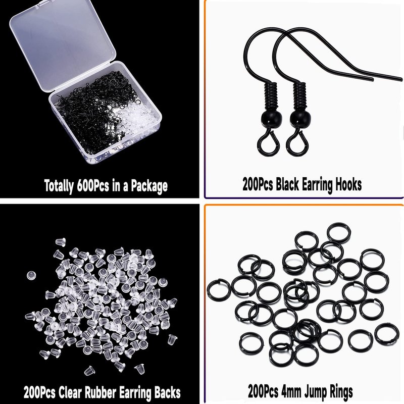 - 600Pcs Earring Making Kit: Package contains 200pcs black earring hooks for jewelry making with 200pcs 4mm clear rubber earring backs and 200pcs 4mm jump rings, enough spare for you to use for a long time.