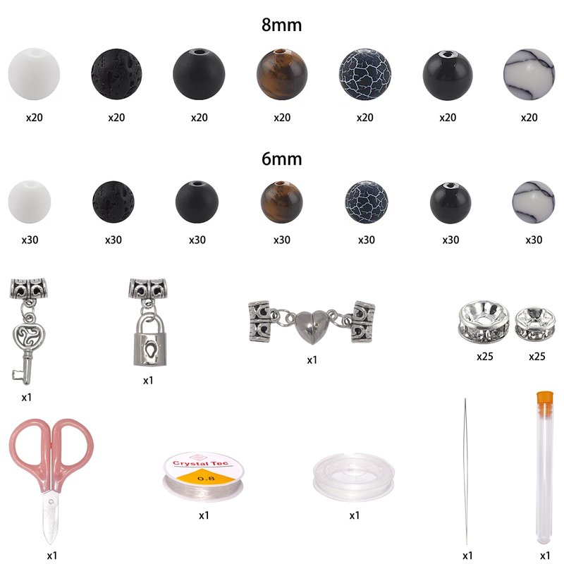 - NATURAL LAVA ROCK BEADS SET: 140 pcs chakra beads(8mm), 210pc crystals beads(6mm), 50 pcs antique silver spacer beads(6mm,8mm), 4 Set Accessories(Heart Magnetic Clasp,Key and Lock), containing two rolls of crystal string and a handy plastic case for jewelry making.
