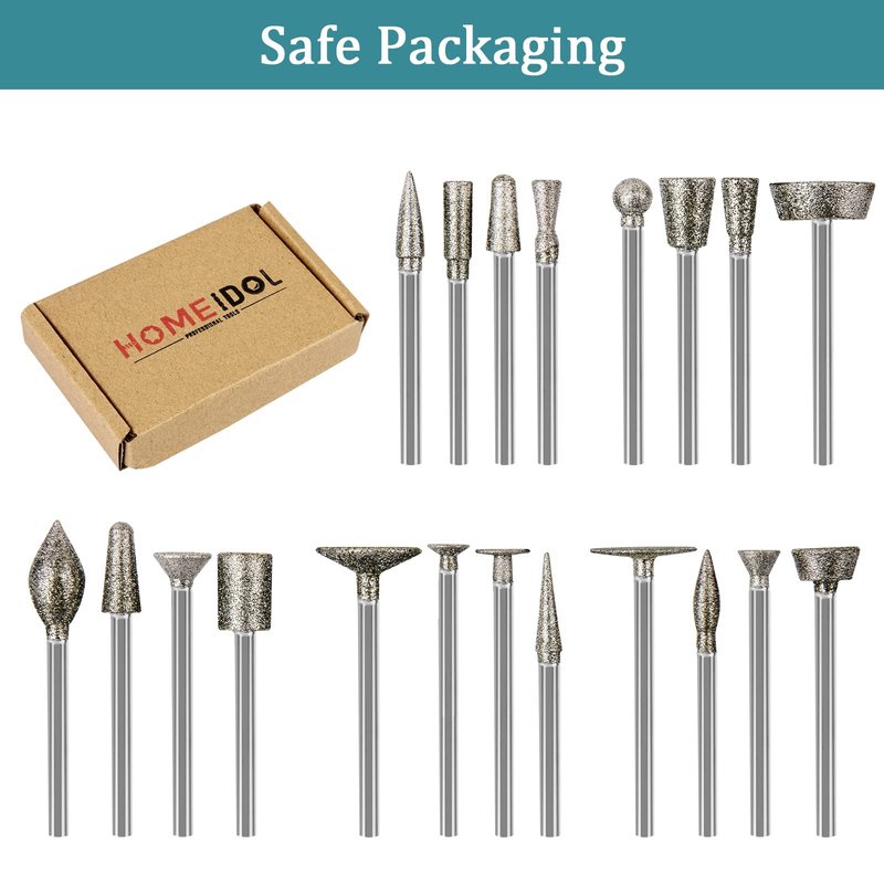 - √【Universal Shank】Rotary tool diamond burrs set,Shank Diameter:0.118"(3mm); Head Diameter: 4mm 5mm 6mm 8mm 10mm 16mm. Package include :20 Pcs x diamond mounted grinding burr.