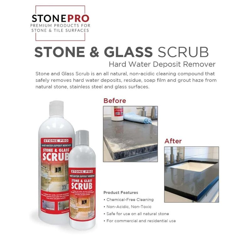 Hard water deposits also known as hard water stains or mineral deposits, are a common problem on countertops, metal fixtures, windows, baths and showers. Stone and Glass Scrub is an all natural, non-acidic cleaning compound that safely removes hard water deposits, residue, soap film and grout haze.