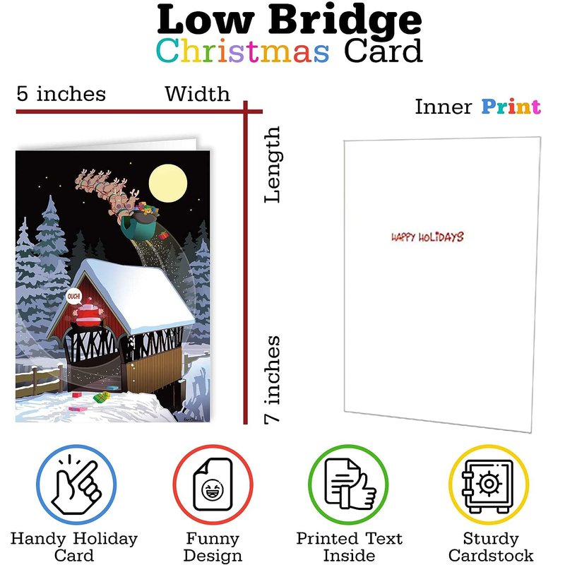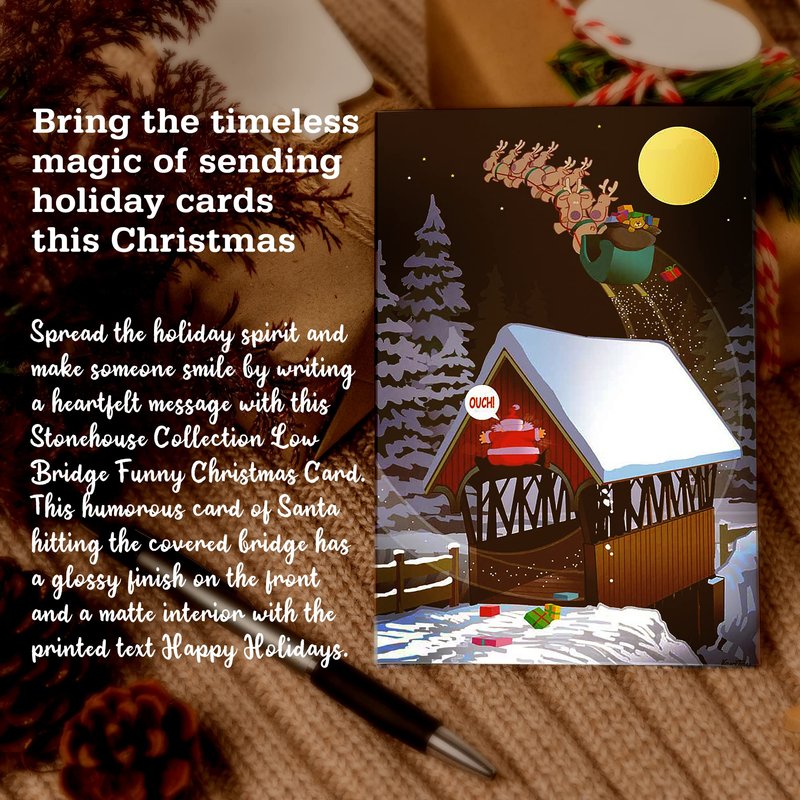 Stonehouse Collection Funny Low Bridge Theme Boxed Christmas Cards are an easy way to spread the joy of the holidays and share the love with your friends, family members, and coworkers. Give them a gift they can treasure for a long time. Our 5x7 folded Christmas greeting cards are made from quality material that won't get easily creased or folded. These holiday greeting cards have a glossy exterior finish, which makes the illustrations and graphics pop, while the non-glossy, matte interior of the card will allow you to write much more smoothly and easily without ink smudges. Our greeting cards feature a unique and funny design that will make your friends, family and loved ones smile from ear to ear. You can write a personalized message and make them feel special this holiday season. Send them these holiday cards with envelopes and make someone's holiday season a little more special with these unique and witty Christmas cards that are sure to put a smile on their face.