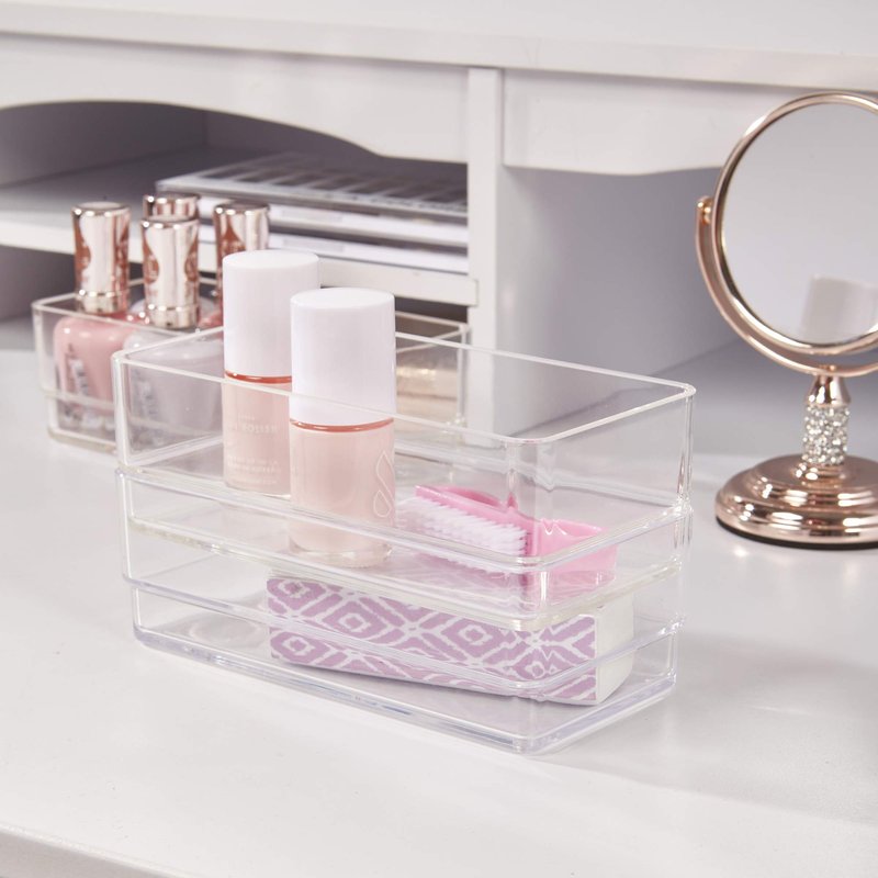 Time to get your drawers organized! With many applications and configurations, these individual organizers can fit side by side to sort daily essentials in your drawers! Each container easily stacks for multiple layers of storage. Great for deep drawers! Purchase additional sizes to customize your organizational needs. Create modular sets to organize drawers in your entire house. Clear, break-resistant plastic fits in any décor. No assembly required. Cleans easily with mild soap and warm water. Made in USA.