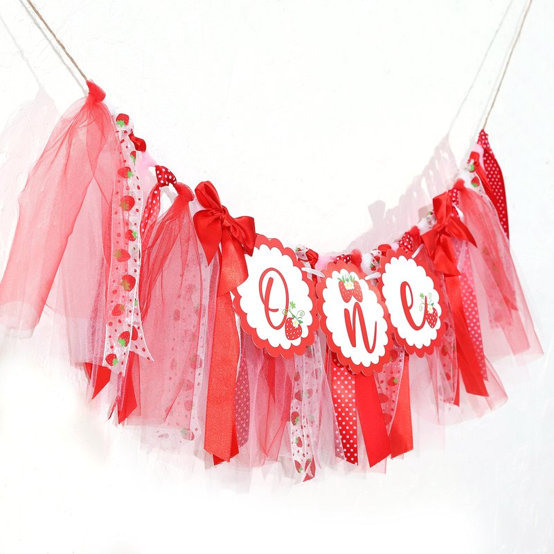 - 🍓 FUN AND PLAYFUL DESIGN - Decorate your little one's party with this strawberry themed Total banner length is 80 inches to ensure extra length to tie around any high chair tray, banner section is about 22 inches across. The banner has several strips of strawberry, polka dots, chevron and striped fabrics, pom pom trim and ribbon in pink, red attached to twine