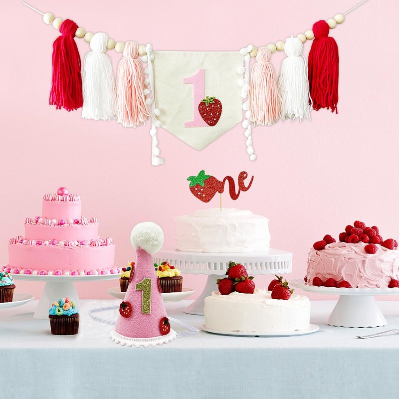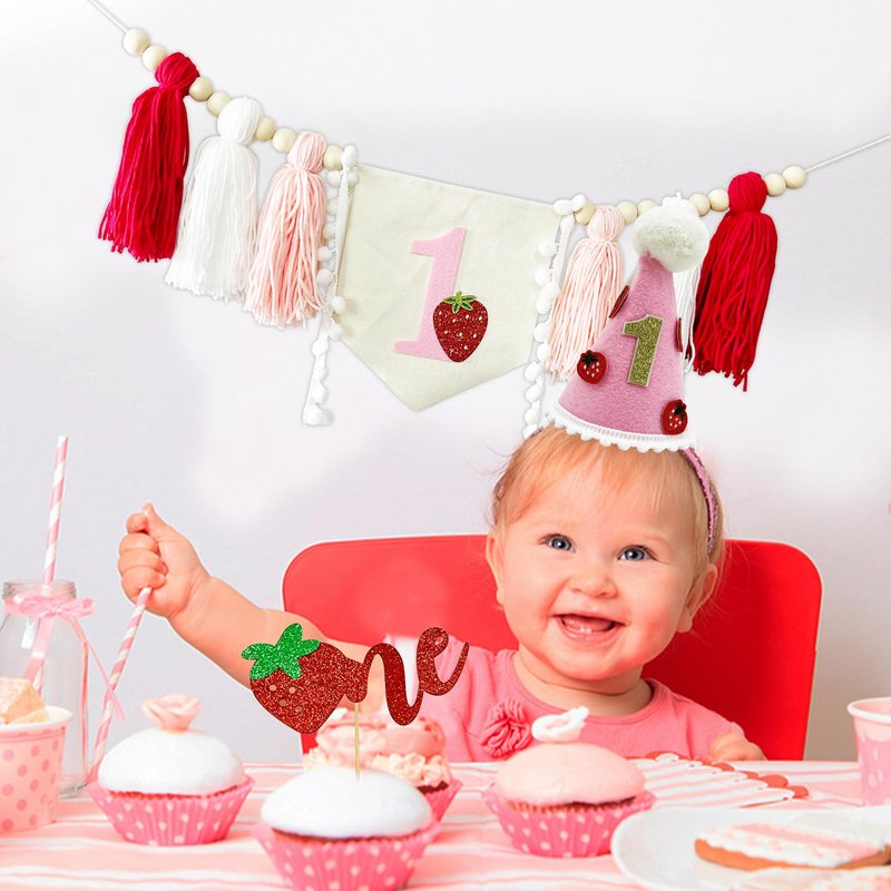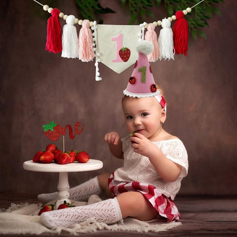 - IDEAL BABY BIRTHDAY GIFT :Still searching for that perfect birthday banner? Set your sights on our delightful strawberry birthday banner.This mini strawberry 1st birthday hat is irresistibly cute. The attention to detail, from the pink felt material to the pink pom-pom topper,creates a charming and delightful look that is sure to capture everyone's heart.Our cake topper is unique design.