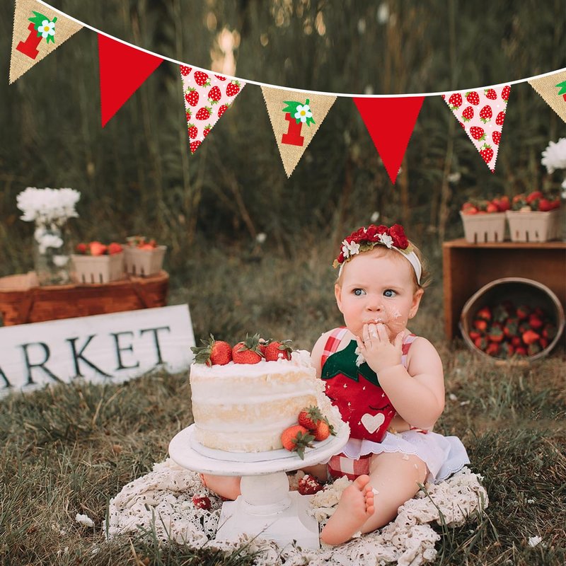 - Unique Design - Unique strawberry theme element pattern 1st designs plus pennants with sweet berry printed、red、linen burlap,It makes an attractive backdrop for videos and photos.Make your baby's first birthday more special and memorable.