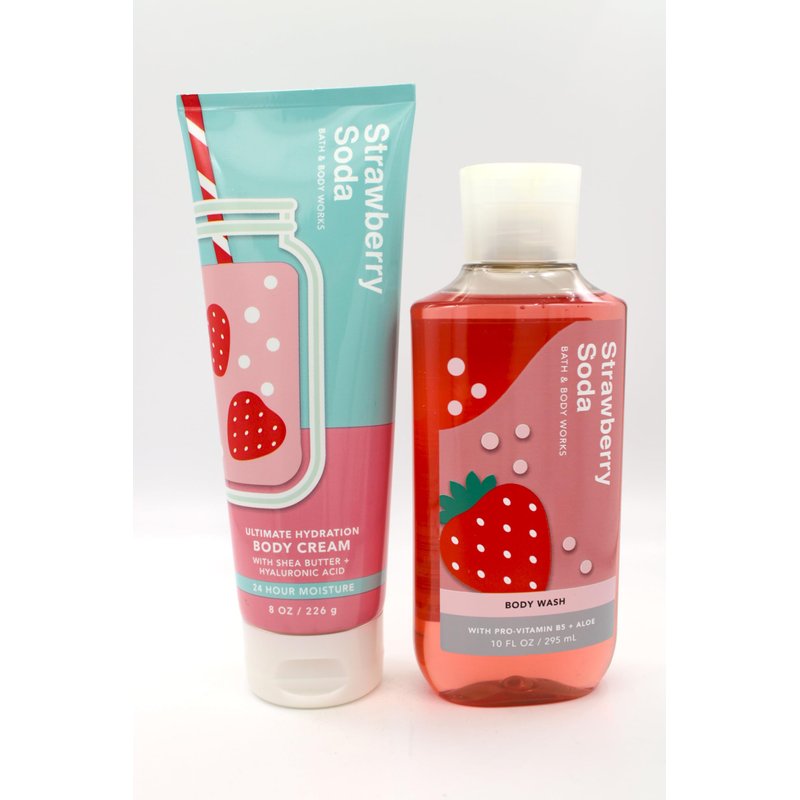 Fragrance: Strawberry Soda / Fragrances Notes: Fresh Strawberries, Bubbly Seltzer, Crushed Ice / Included in Set: Shower Gel Body Wash (10 fl oz/ 295 mL) and Ultimate Hydration Body Cream (8 oz / 226 g) / Made without Parabens / Not Tested on Animals & Vegan / Dermatologist Tested