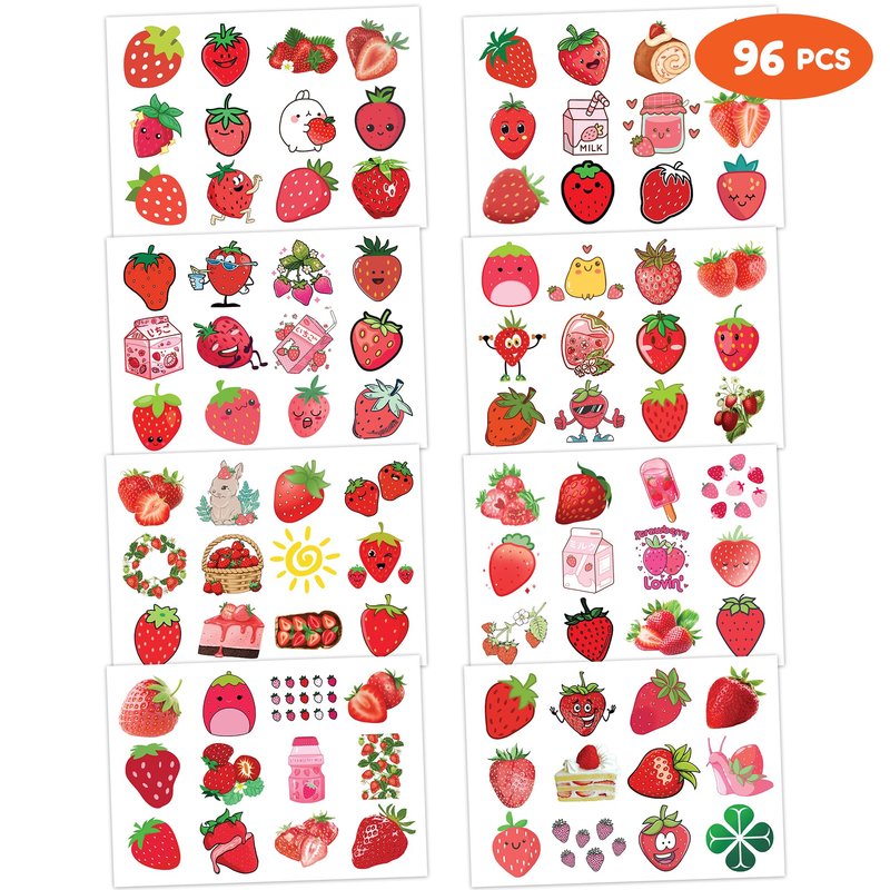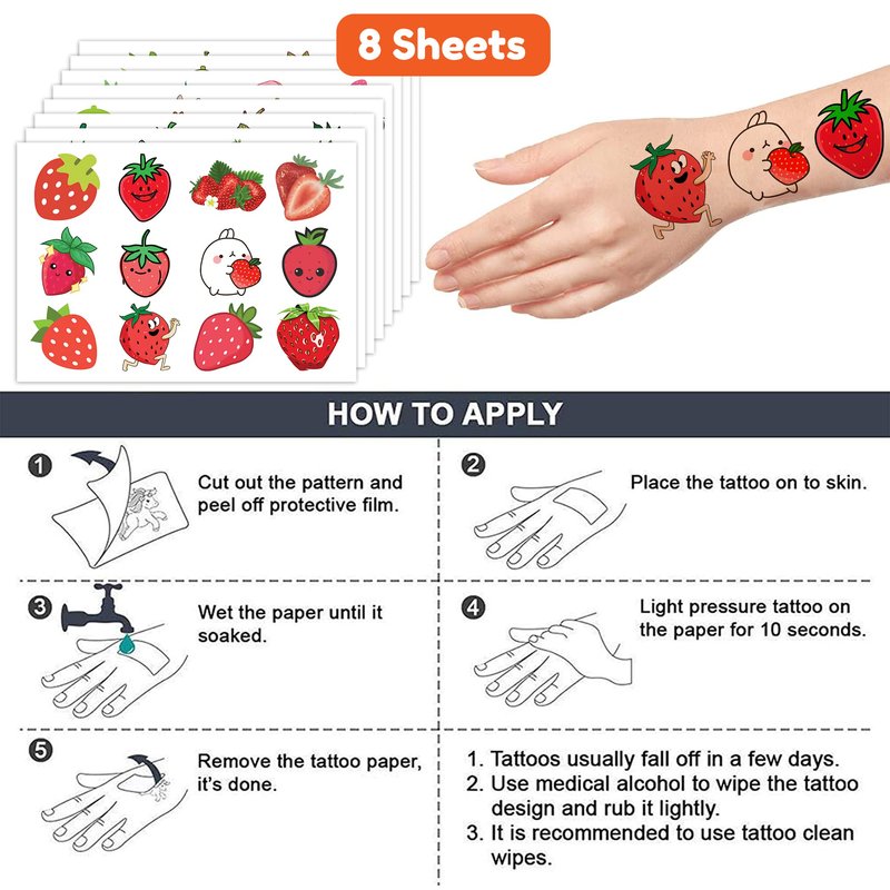 - 🍓【PERFECT TATTOOS FOR THEMED STRAWBERRY DECORATIONS】: Strawberry temporary tattoo stickers include 8 sheets in total. There are 96Pcs super cute tattoo differences. Perfect for giving out party favors and holiday theme small gifts. The size of each sheet is 6.1 * 3.1 inches. One size fits kids