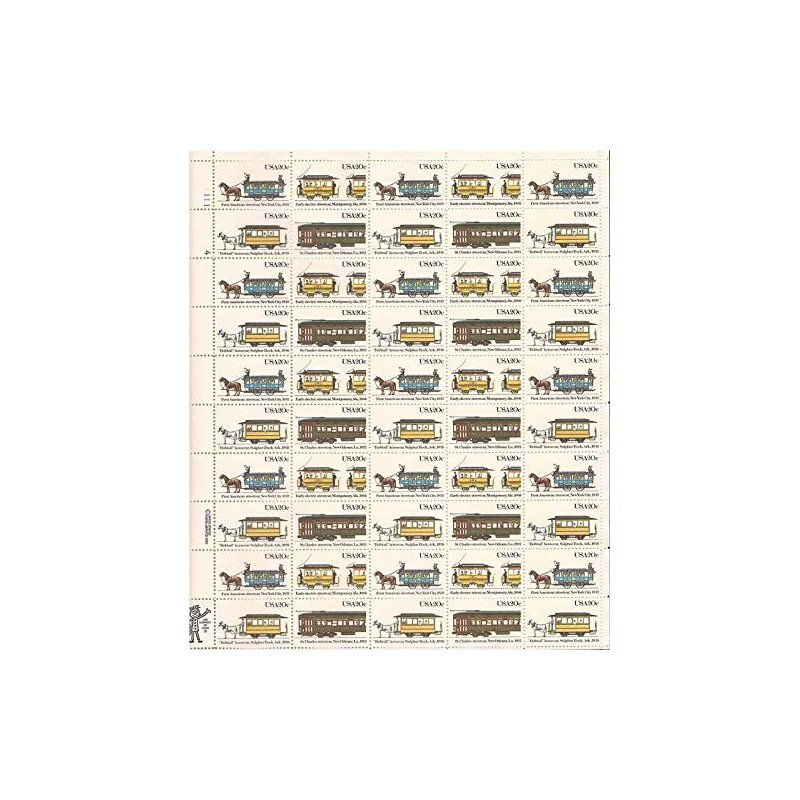 This is a stunning 50 stamp sheet, issued by the United States in 1983, depicting streetcars and featuring the first American streetcar in New York City, an early electric streetcar in Montgomery, Alabama, a St. Charles streetcar in New Orleans, Louisiana, and the "Bobtail" horsecar in Sulphur Rock, Arkansas. The sheet is Scott catalog #2059-62.