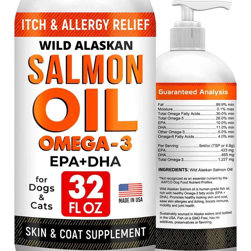 StrellaLab 32 OZ Salmon Oil for Dogs - Omega 3 Fish Oil for Dogs & Cats, Itch & Allergy Relief, Wild Alaskan Salmon Oil Dogs Skin & Coat, Dog Fish Oil Liquid, Shedding Supplement EPA & DHA Fatty Acids