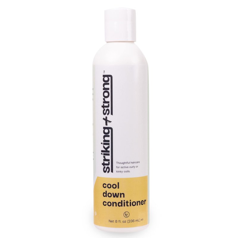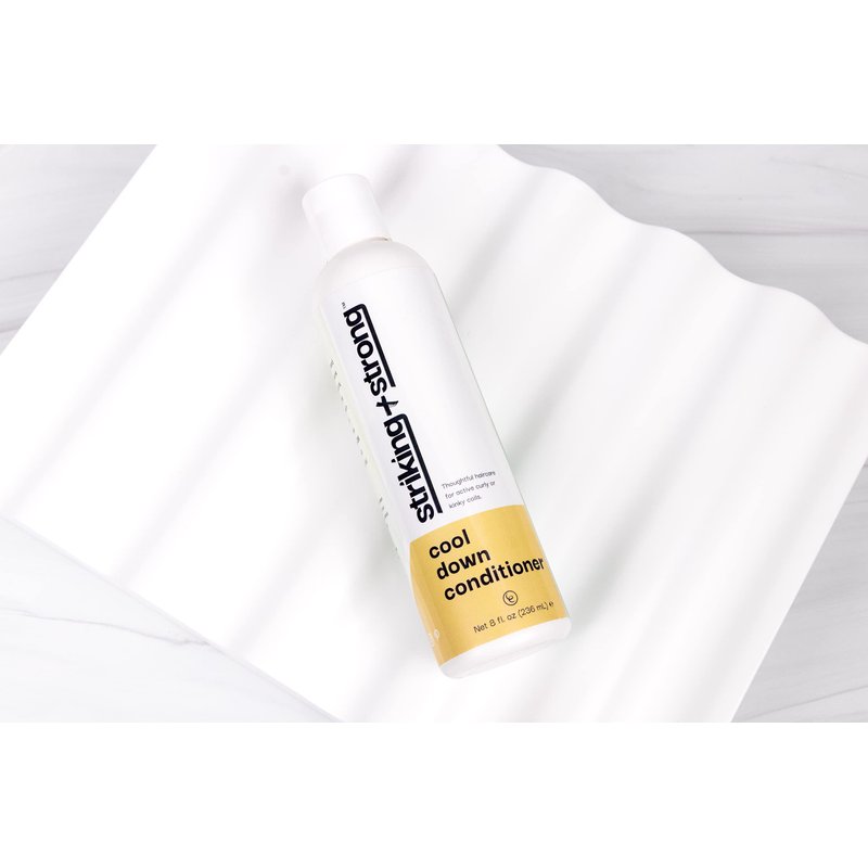 Striking + Strong Cool Down Conditioner | Tailored for Active Lifestyles & Diverse Hair Types | Experience the ultimate in haircare with our luxurious conditioner, specially formulated for wavy, kinky, coily, and curly hair. This hydrating conditioner ensures your curls stay bouncy and beautiful, even after intense workouts. Infused with nourishing ingredients like Aloe, Quinoa, and Sunflower Oil, it provides a silky shine while revitalizing your scalp and hair. Our Cool Down Conditioner delivers a refreshing, tingly sensation, leaving your scalp feeling extra clean and invigorated. The easy-to-use formula works best when applied to clean, wet hair, following one of our Striking + Strong shampoos. Simply let it sit for two minutes before rinsing thoroughly to reveal deeply hydrated, lustrous curls. Committed to clean beauty, our conditioner is free from silicones, phthalates, parabens, DEA, artificial dyes, and harsh sulfates. Striking + Strong stands for problem-solving, diversity, and community, championing the mission that energetic, empowered women of color can maintain healthy, gorgeous hair while embracing an active lifestyle. Elevate your haircare routine with Striking + Strong Cool Down Conditioner – because your curls deserve the best. 8oz