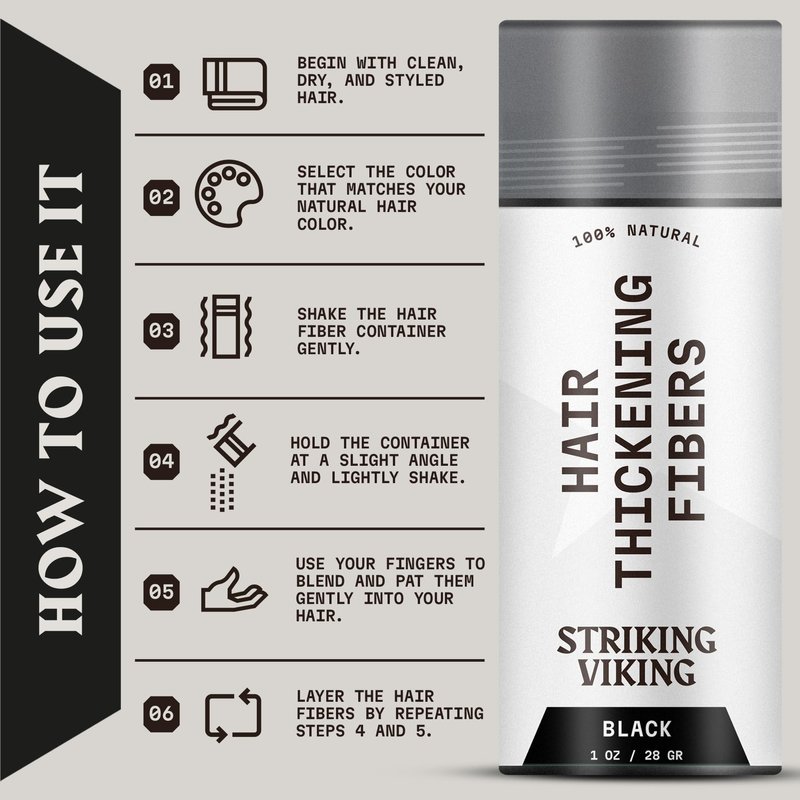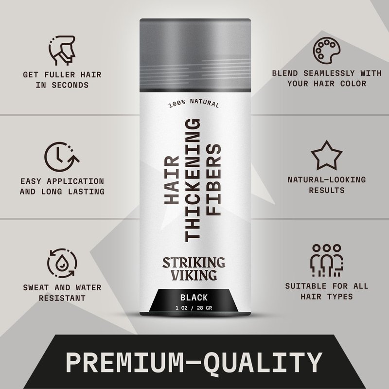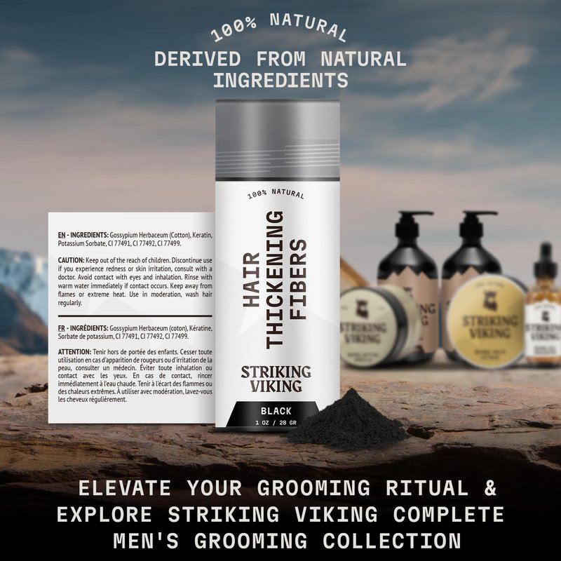 Striking Viking Hair Fibers for Thinning Hair - Hair Building Fibers (Black) 28g - Naturally Derived Formula - Long Lasting Hair Powder for Undetectable, Thicker Looking Hair for Men & Women