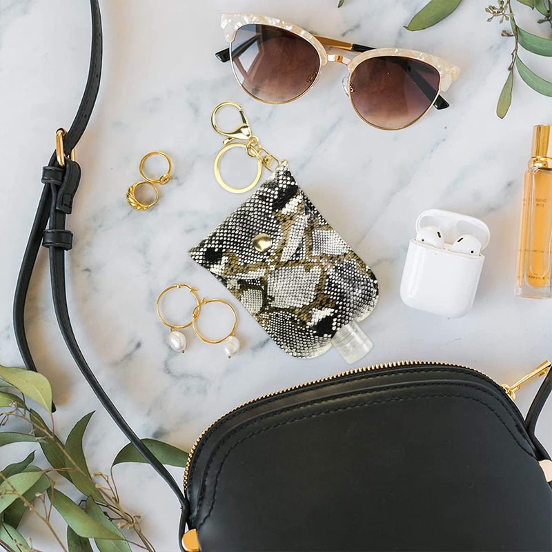 - 2.【Leak-proof and Clean】: The hand sanitizer holder keychain is tightly sealed to prevent liquid leakage. Rigid plastic and leather retention pockets keep bottles safe, and a flip-top design keeps liquids clean.
