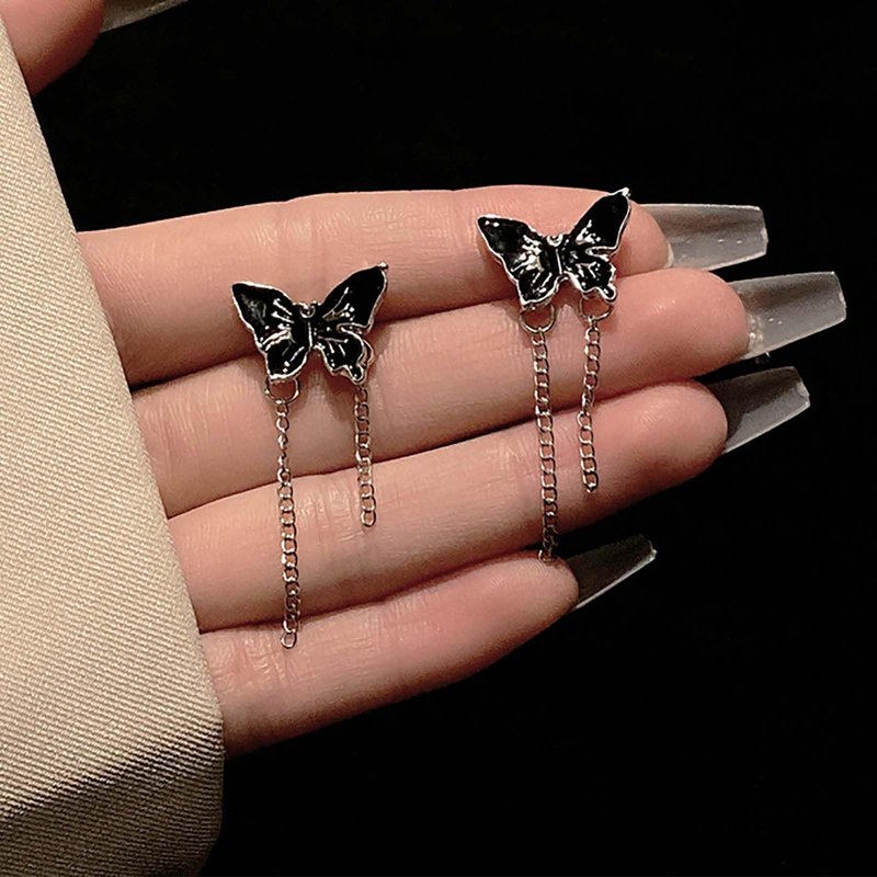 Sttiafay Punk Black Butterfly Drop Earrings Acrylic Butterfly Tassel Chain Earrings Silver Long Butterfly Earrings Black Butterfly Stud Earrings Jewelry for Women and Girls